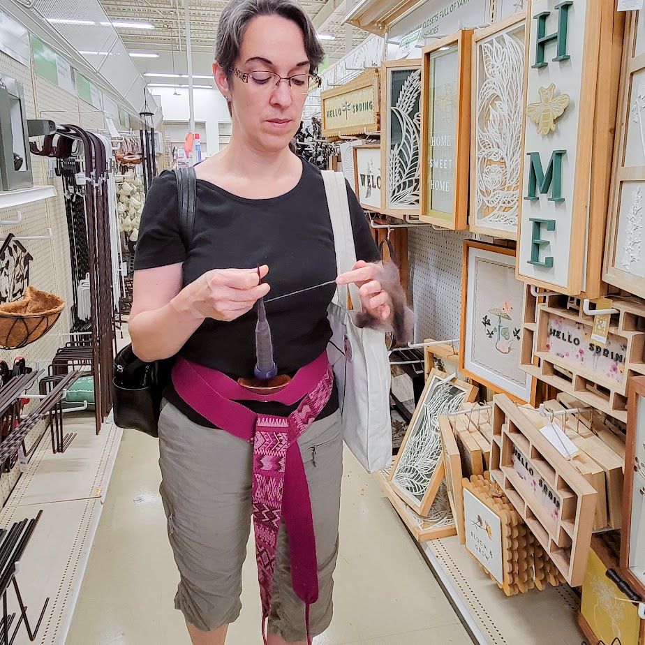 But I also discovered a new way to walk and spin supported at the same time! A friend gifted me a beautiful woven belt made in Guatemala, and it had the perfect sturdiness to cradle my favorite wooden bowl by way of a powerful magnet glued to the bottom of the bowl.
