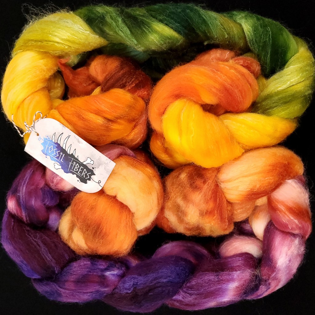 Hawthorn Craze, one of the exclusive Fossil Fiber colorways designed for Spanish Peacock, on BFL/silk (2 oz.)