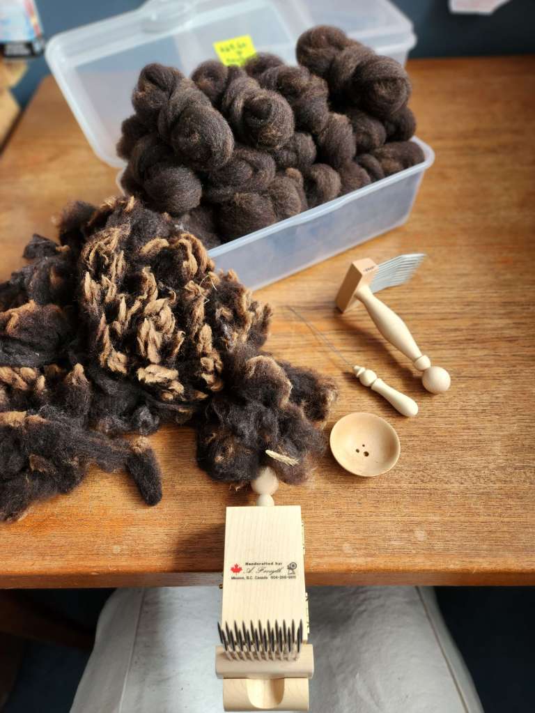Winner’s choice of either 50 g of hand combed top, or 100 g of washed fleece. The image is a representative photo of what is available. (Just the fiber … not the tools!)