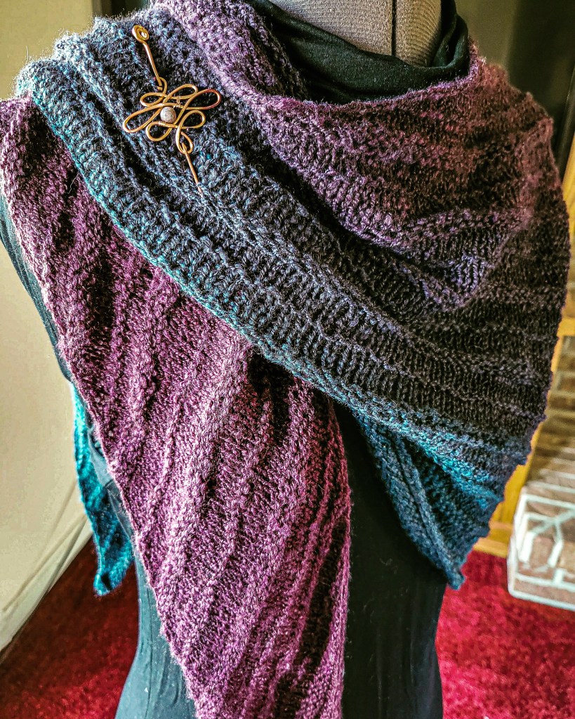 Quaker Yarn Stretcher – available either as a triangle or a rectangle. I have only tried the triangle (“boomerang”) version, and found it offers a great way to knit with handspun yarn of uncertain length. (Am I the only one who consistently fails to measure finished yardage?) I still need to write the blog post about the gradient fiber I spun for this pattern, but in the meantime here is a photo.